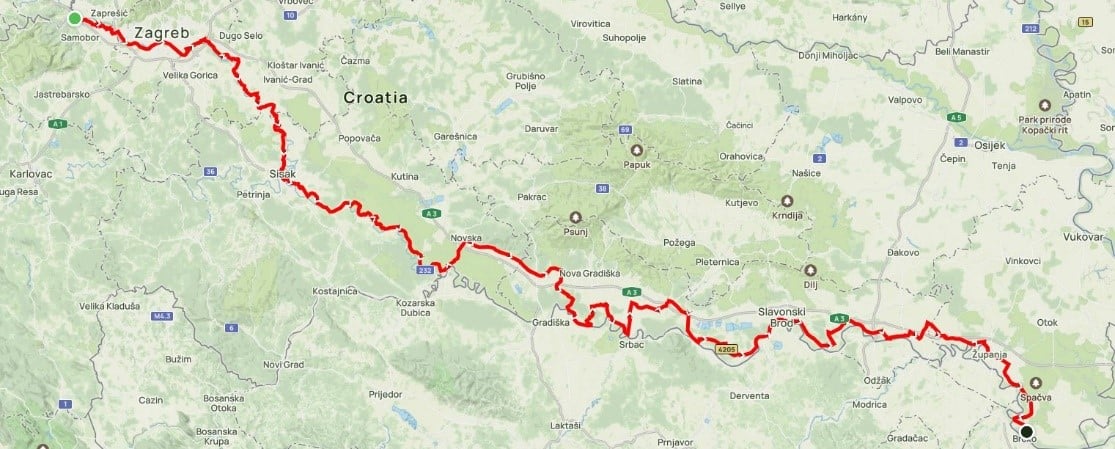 U Hrvatskoj će biciklisti uživati u raznolikim krajolicima i kulturnim znamenitostima – od jezera i šuma u okolici Samobora, preko povijesnog Zagreba i šetnice uz Savu i Starog grada u Sisku. Ruta vodi kroz Park prirode Lonjsko polje, poznat po europskom selu roda Čigoč i tradicijskoj drvenoj arhitekturi, te kroz memorijalno područje Jasenovac. Nastavlja se prema Slavonskom Brodu s poznatom tvrđavom Brod i kućom Ivane Brlić Mažuranić, zatim kroz Županju, grad bogate šokačke tradicije, sve do Spačvanskog bazena – najvećeg kompleksa hrastovih šuma u Europi.