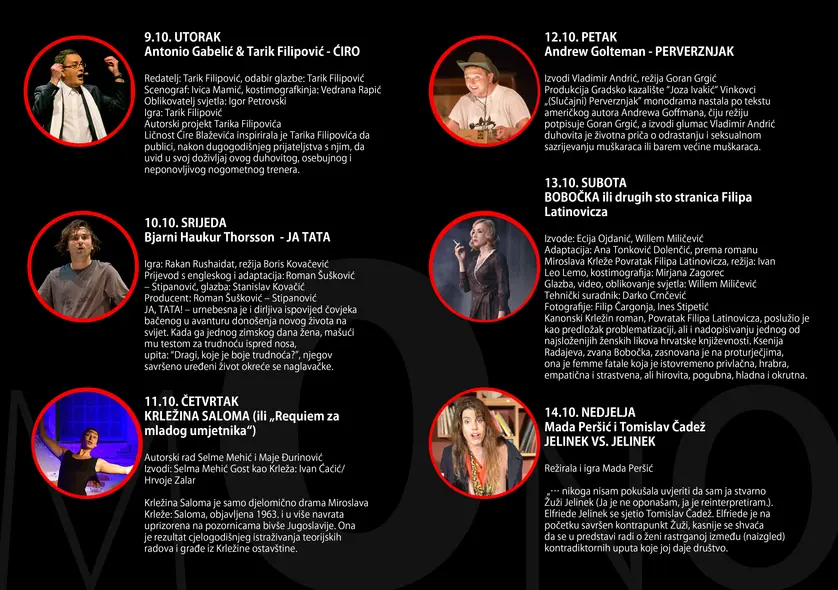 Tu su još i kultna zagrebačka monodrama 'Ja tata' u izvedbi Rakana Rushaidata, 'Bobočka ili sto stranica Filipa Latinovitza' u izvedbi Ecije Ojdanić te 'Perverznjak' u interpretaciji Vladimira Andrića.
