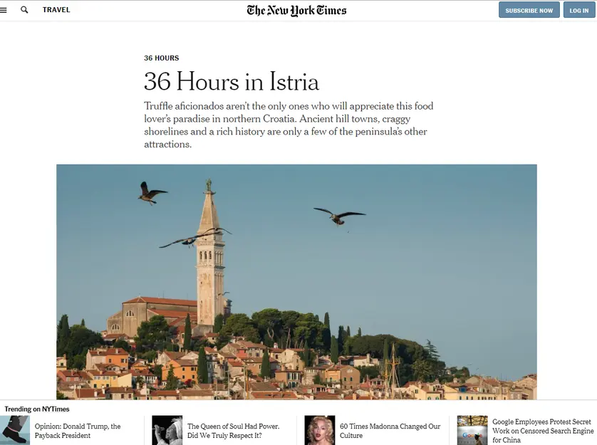 Ovako nas u svjetski poznati vodič The New York Timesa posvećen Istri uvodi David Farley u netom objavljenom izdanju "36 Hours in Istria/36 sati u Istri". Popularno izdanje "što raditi kada imate 36 sati za upoznavanje jednog mjesta", namijenjeno je putnicima i čitateljima kao uvod u otkrivanje destinacija diljem svijeta, kroz kratka, vikend putovanja.